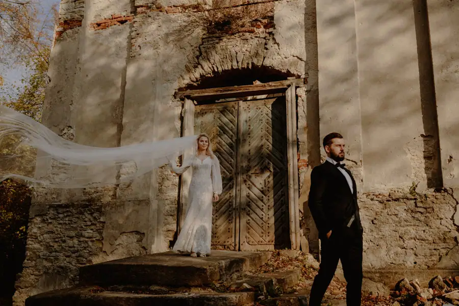 Było to pewnego pięknego październikowego popołudnia. Jesienne słońce delikatnie grzało, a w tle słychać było delikatny szum wiatru, który poruszał drzewami wokół. Świetnie się złożyło, ponieważ tego właśnie dnia umówiliśmy się na sesję ślubna z Magdą i Mateuszem. Odwiedziliśmy dwa miejsca niedaleko Tomaszowa Lubelskiego. Najpierw zwiedzaliśmy ruiny starej prawosławnej cerkwi, która emanowała tajemniczością i skrywaną historią. Na koniec zaś udaliśmy się nad małe skryte w lesie jeziorko, gdzie łapaliśmy ostatnie promienie zachodzącego słońca. Podsumowując sesja ślubna w ruinach cerkwi była strzałem w dziesiątkę